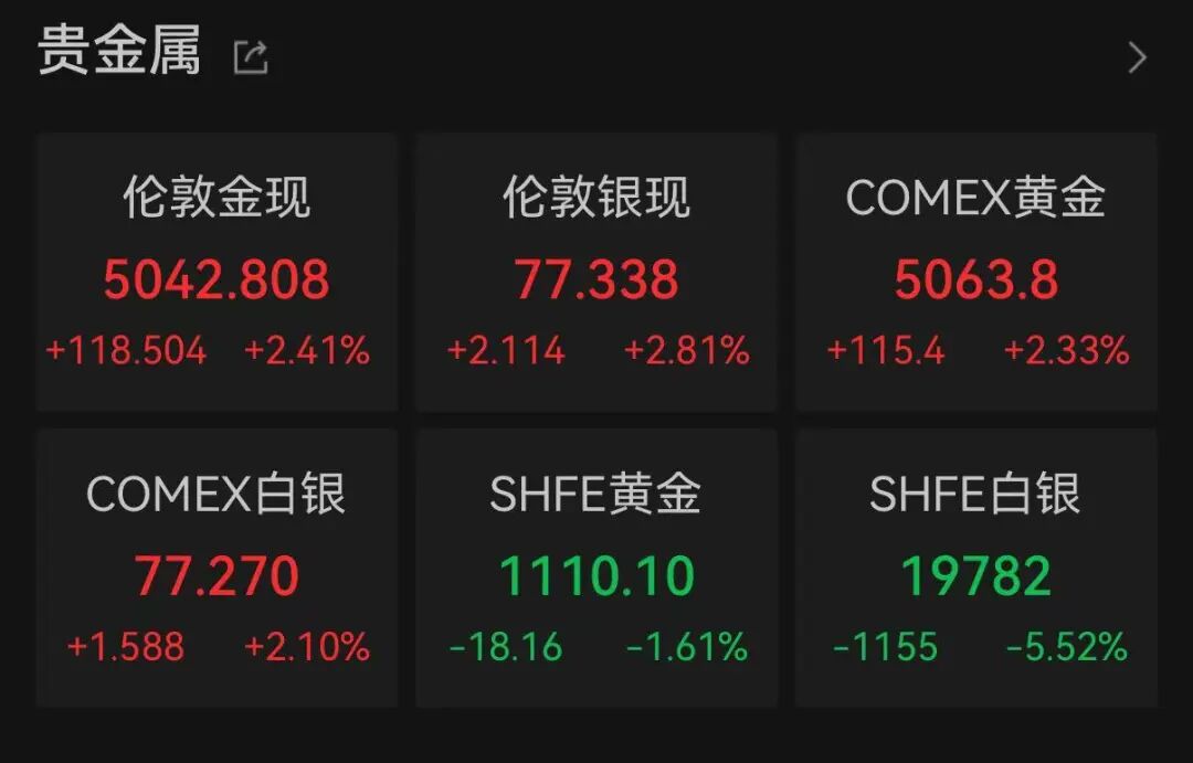 当地本领13日,黄金白银再度反弹,现货黄金站稳5000好意思元大关。适度当日收盘,现货黄金涨2.41%,报5042.81好意思元/盎司;COMEX黄金期货涨2.33%,报5063.8好意思元/盎司。现货白银涨2.81%,开云报77.34好意思元/盎司;COMEX白银期货涨2.10%报77.27好意思元/盎司。